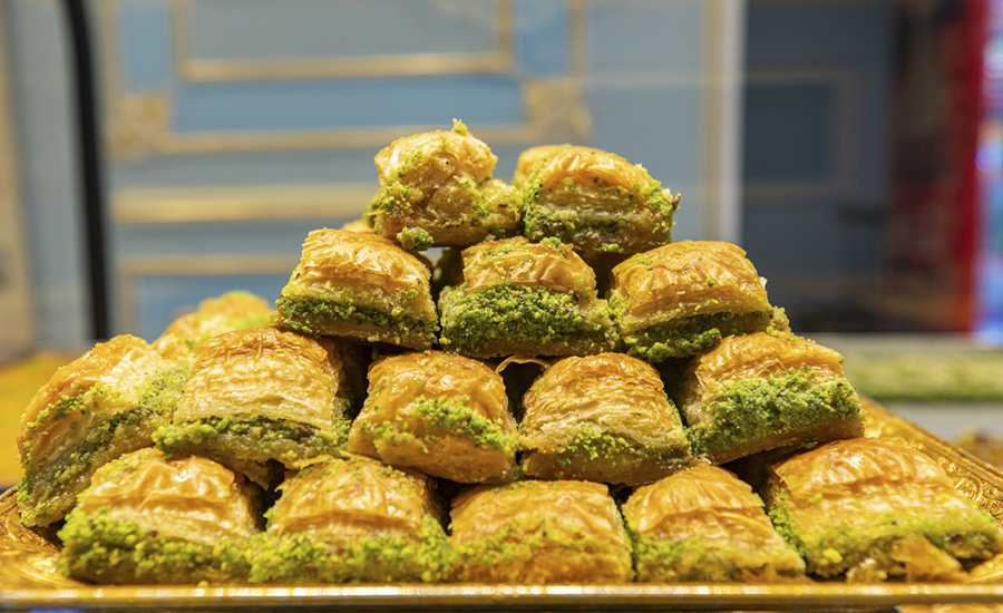Krispigt filodeg fyllt med nötter och dränkt i söt sirap.